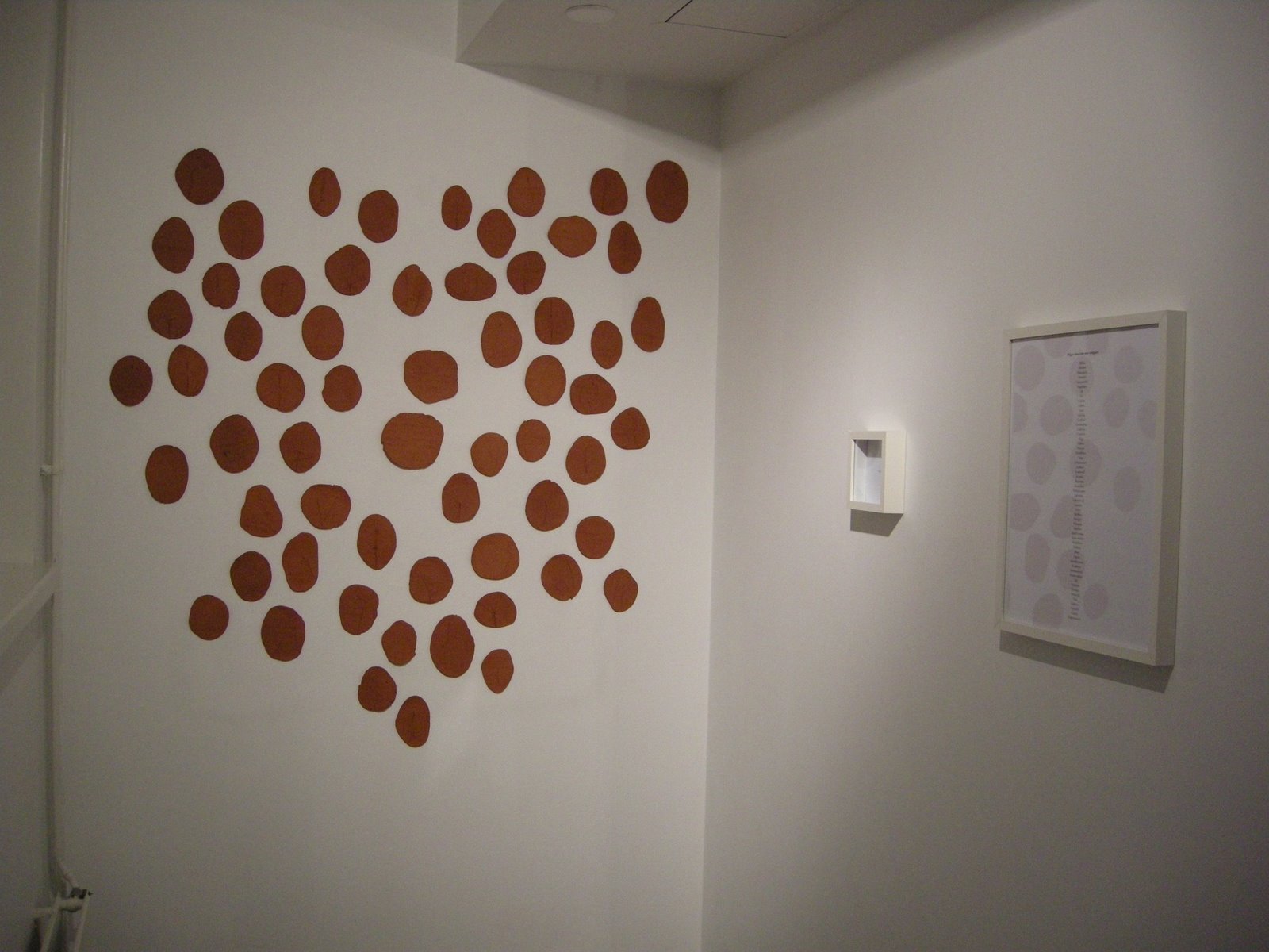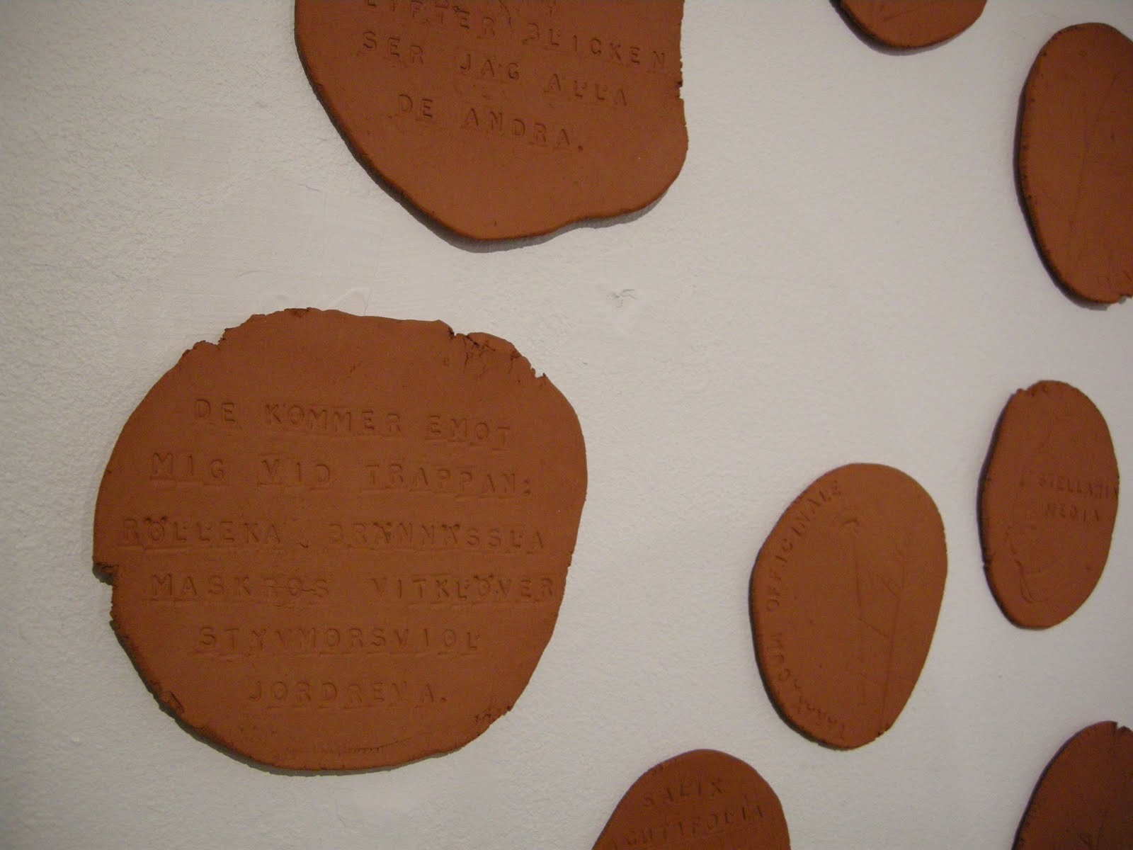 Materials: Fired clay tablets (Finnish red clay) with patterns of herbs from my garden which I picked in the summer of 2007. In the frames there is text in Swedish. In the big frame there is a list of the same herbs as pictured on the clay tablets. In the small frame there is a question: "Vad blir kvar?" - "What is left?"