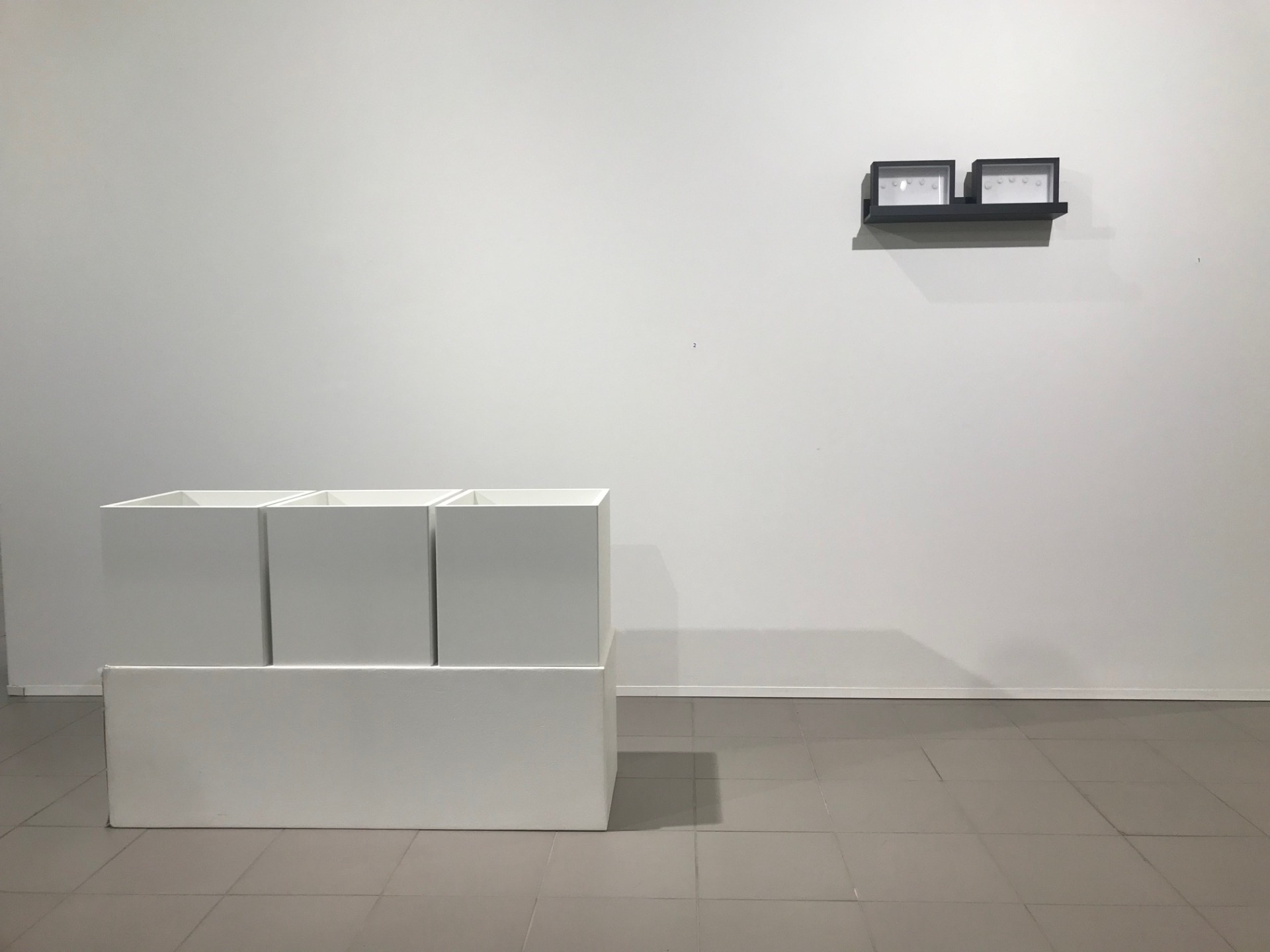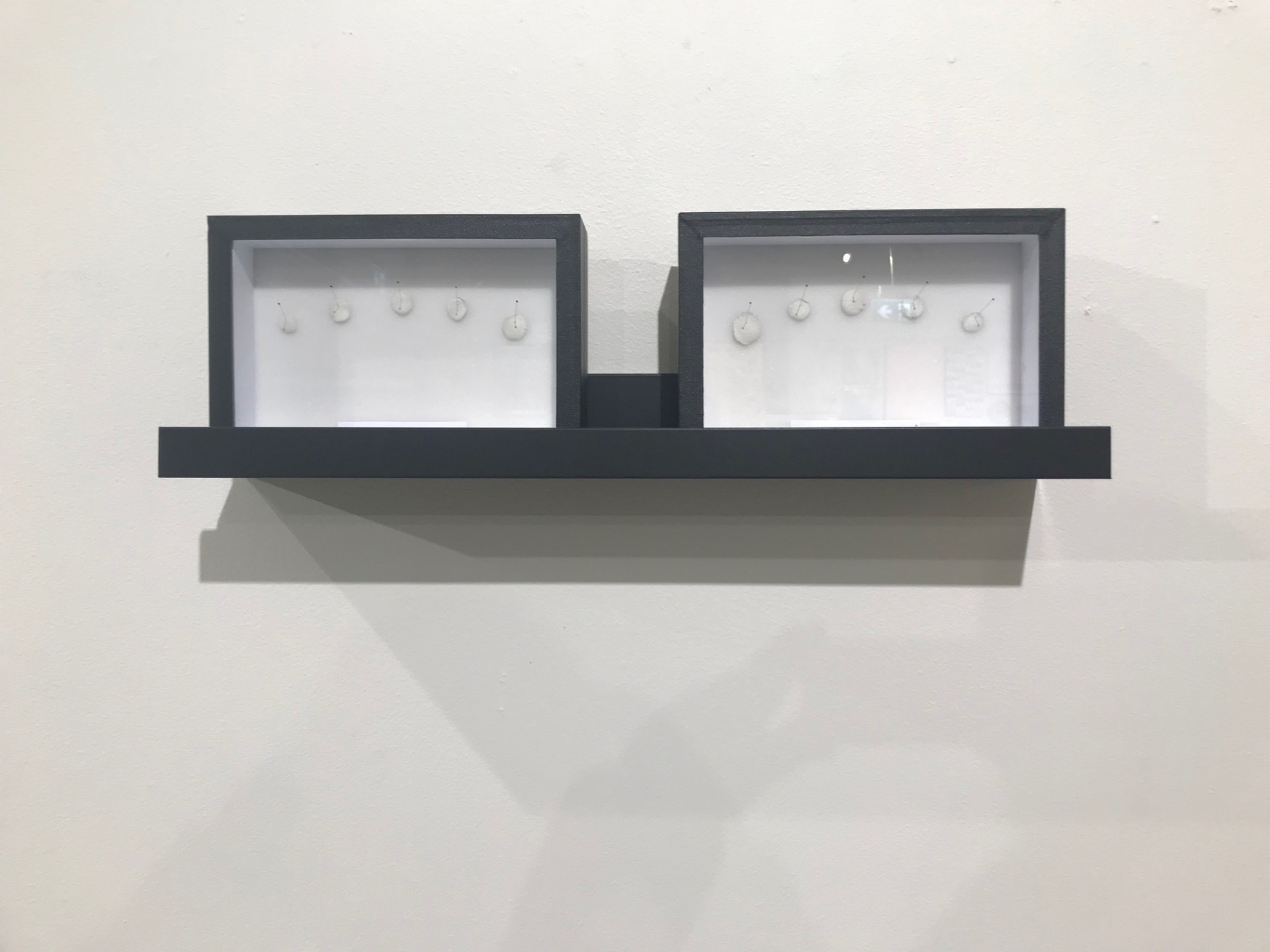 Materials: Fingerprints of the artist in white clay, Insect display case in black wood, Stainless steel insect specimen pins.